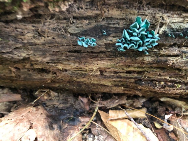 After seeing all the turquoise stained wood on trail, we finally found the accompanying mushrooms for chlorociboria aeruginascens or chlorociboria aeruginosa. They are tiny, delicate jewels, and so satisfying to spot.
